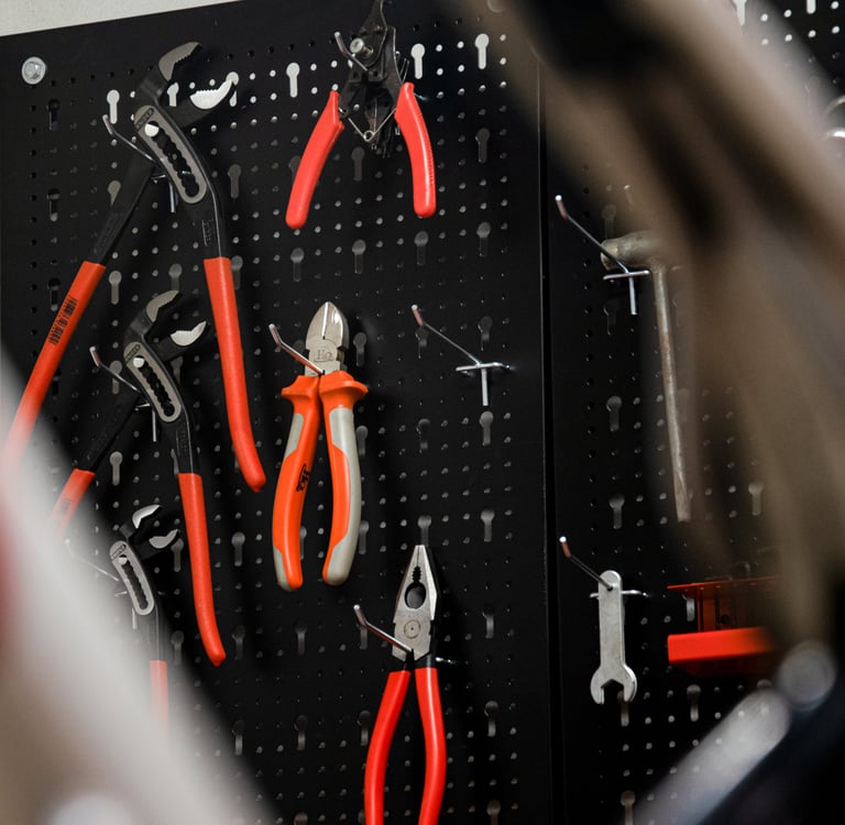 Cavalletto (alto e basso), toorx, brugole, chiavi, cacciaviti, pinza, pinze a pappagallo, tronchesino, pinze per anelli seeger, pompa d'aria più alcuni altri attrezzi disponibili su richiesta